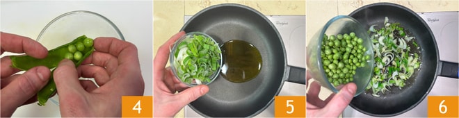 Écossez les petits pois 4. Coupez le cébette en deux, puis en losanges, mettez-le dans une poêle antiadhésive avec un filet d'huile 5 et faites-le cuire à feu doux pendant 3-4 minutes. Ajoutez ensuite les petits pois 6.