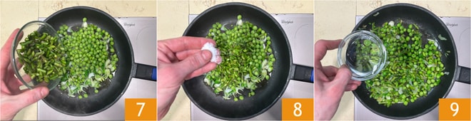 Ajoutez les tiges d'asperges 7, assaisonnez de sel 8 et ajoutez un peu d'eau 9. Faites cuire pendant 8-10 minutes en remuant de temps en temps. Pendant ce temps, faites blanchir les pointes d'asperges pendant 1-2 minutes et réservez.