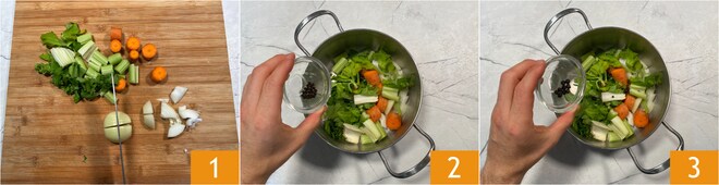 Pour préparer le poulet à la vapeur avec sauce au thon, commencez par les légumes : nettoyez l'oignon et le céleri, puis épluchez la carotte et coupez le tout en petits morceaux (y compris les feuilles de céleri) 1. Mettez les légumes dans une grande casserole avec du poivre 2 et des baies de genièvre 3.