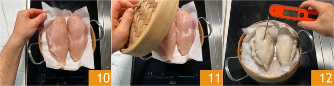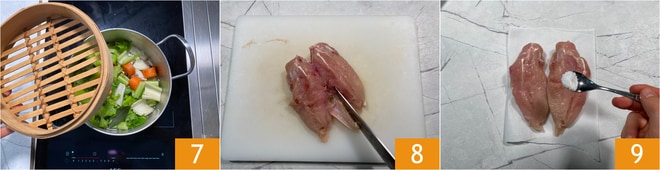 Couvrez avec le panier vapeur 7 et allumez le feu. Pendant ce temps, nettoyez la poitrine de poulet en retirant l'os, le cartilage et les fibres 8. Salez sur les deux faces 9.