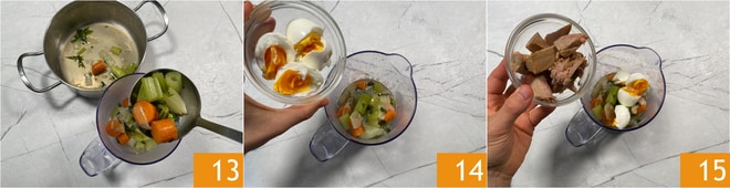 Lorsque le poulet est cuit, laissez-le refroidir et égouttez les légumes dans le bol du mixeur avec un peu d'eau 13; vous pouvez ajouter davantage d'eau par la suite pour ajuster la consistance. Ajoutez les œufs durs 14 et le thon 15.