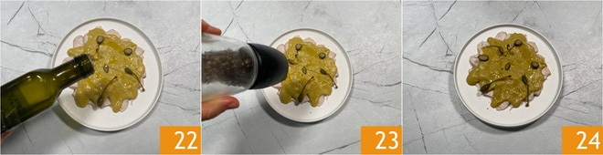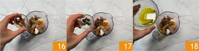Ajoutez également les anchois 16, les câpres 17 et l'huile 18.