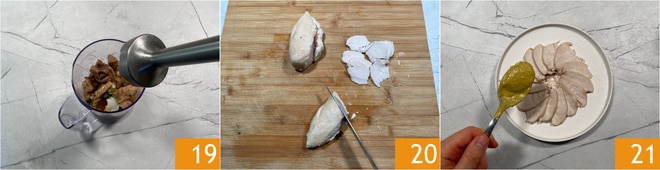 Mixez jusqu'à obtenir une crème dense et homogène 19. À ce stade, coupez finement la poitrine de poulet 20 et dressez les assiettes en ajoutant la sauce au thon 21.