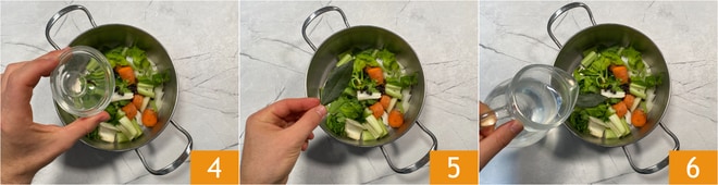 Ajoutez également les clous de girofle 4, les feuilles de laurier 5 et l'eau 6.