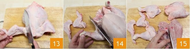 À ce stade, poursuivez avec le nettoyage et la découpe du poulet : placez le poulet entier sur une planche à découper et commencez par couper les ailes 13, continuez en séparant les cuisses 14 et enfin divisez et désossez la poitrine, en vous assurant d'avoir éliminé l'os en Y et les autres morceaux de cartilage 15. Vous pouvez également utiliser le poulet déjà découpé et désossé que vous trouvez au supermarché.