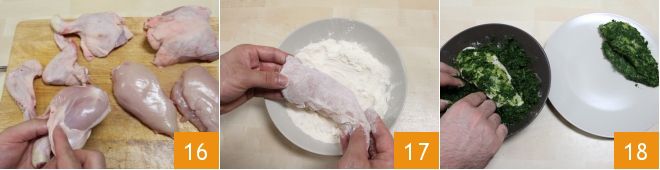 Épluchez les différents morceaux de poulet que vous avez découpés 16 puis farinez-les 17. Une fois farinés, prenez le hachis de bettes et d'herbes aromatiques que vous aviez mis de côté et enrobez les morceaux de poulet de ce mélange sur les deux côtés 18.