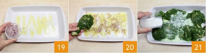 Versez un filet d'huile dans un plat allant au four et ajoutez-y une gousse d'ail pelée coupée en deux ainsi que l'échalote que vous avez finement hachée auparavant 19. Disposez maintenant les morceaux de poulet farinés et enrobés dans le plat 20 et arrosez-les de lait pour les attendrir et éviter qu'ils ne sèchent pendant la cuisson 21. Vous pouvez également remplacer le lait par du bouillon de légumes, découvrez comment le préparer en consultant notre École de cuisine : bouillon de légumes.