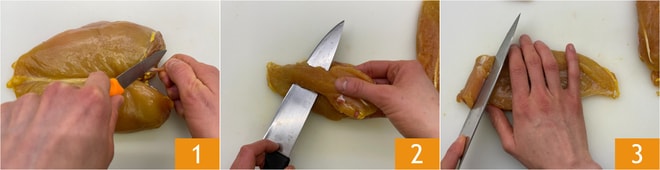 Pour préparer le poulet croustillant au four, commencez par nettoyer le blanc de poulet en enlevant les éventuels cartilages et petits os 1. Découpez d'abord des filets 2, puis inclinez légèrement le couteau pour obtenir une découpe 3.