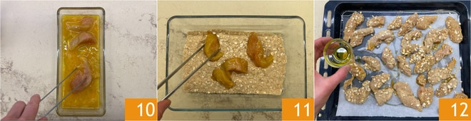Passez la viande d'abord dans l'œuf 10, puis dans la panure 11. Tapissez la plaque de papier sulfurisé et huilez-la avec 5 g d'huile. Répartissez les morceaux de viande sur la plaque et arrosez avec les 5 g d'huile restants 12.