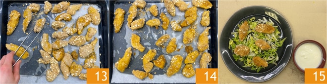 Faites cuire au four statique à 180° pendant 20 minutes, en retournant la viande à mi-cuisson 13. Une fois doré 14, votre poulet croustillant est prêt à être servi 15 !