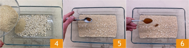 Dans un bol, mettez les flocons d'avoine et la chapelure 4, puis mélangez. Ajoutez ensuite le piment en poudre 5 et le paprika 6.