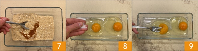 Mélangez à nouveau 7 pour obtenir une panure homogène. Dans un autre bol, cassez les œufs, ajoutez une pincée de sel 8 et battez avec une fourchette 9.