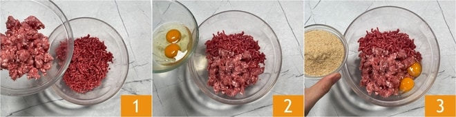 Pour préparer les boulettes au citron, mélangez dans un bol la viande hachée de bœuf et la saucisse émiettée 1, puis ajoutez les œufs 2 et la chapelure 3.