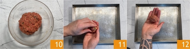 Vous devez obtenir un mélange compact et homogène 10. Prélevez environ 55 g de pâte et donnez à la boulette une forme ronde 11, en l'aplatissant légèrement aux extrémités 12.