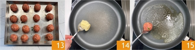 Avec ces quantités, vous obtiendrez 16 boulettes 13. Dans une grande poêle, faites fondre le beurre 14 et déposez-y les boulettes 15.
