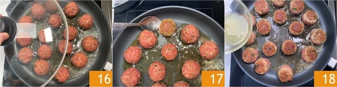 Faites dorer les boulettes pendant 5 minutes à feu moyen-vif, en couvrant avec un couvercle. À ce stade, retournez les boulettes avec une cuillère ou une spatule 17; si elles ne sont pas encore dorées de ce côté, poursuivez la cuisson pendant encore 2 minutes. Après les avoir retournées de l'autre côté, déglacez avec le jus de citron 18.