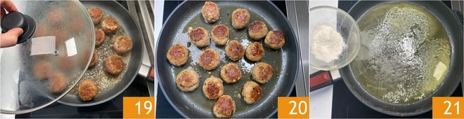Couvrez à nouveau avec le couvercle 19 et continuez la cuisson pendant encore 8 minutes. Une fois cuites 20, retirez les boulettes de la poêle et gardez-les au chaud. Dans la même poêle, faites fondre le beurre pour la sauce 21.
