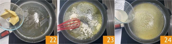 Une fois fondu, ajoutez la farine 22 et mélangez avec un fouet pour éviter la formation de grumeaux 23. Ajoutez maintenant le jus de citron et le bouillon de légumes chaud 24.