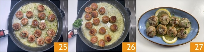 Remettez les boulettes dans la poêle 23 et faites cuire à feu doux pendant une minute, en remuant délicatement. Enfin, garnissez avec du zeste de citron râpé et du persil 26. Vos boulettes au citron sont prêtes à être servies encore chaudes 27 !