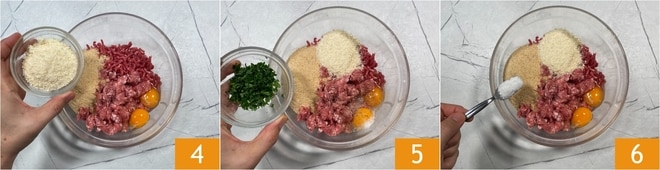 Ajoutez également le pecorino râpé 4, le persil haché 5 et le sel 6.
