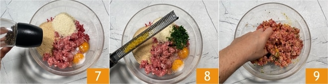 Enfin, assaisonnez avec un tour de moulin à poivre noir 7 et le zeste de citron râpé 8. Pétrissez énergiquement avec les mains pour bien amalgamer le tout 9.