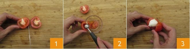 Pour préparer les boulettes caprese, commencez par laver les tomates et les sécher. Coupez-les en deux 1 et avec une cuillère parisienne, retirez la pulpe et les graines intérieures 2. Placez au centre de chaque tomate cerise une petite mozzarella 3.