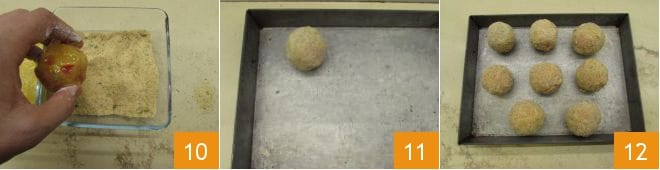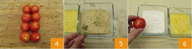 et enfin dans la chapelure 10. Disposez-les sur un plateau 11 et continuez jusqu'à paner toutes les tomates cerise 12. À ce stade, versez l'huile de tournesol dans une casserole et chauffez-la jusqu'à atteindre la température de 160°.