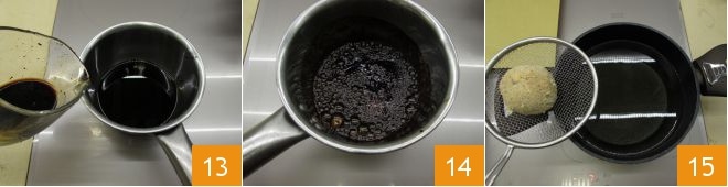 Versez le vinaigre balsamique dans une petite casserole 13 et chauffez-le jusqu'à obtenir une réduction 14. Cela prendra environ 3 minutes. Lorsqu'il aura réduit de moitié, retirez-le du feu. Dès que l'huile est chaude, plongez la première boulette 15,