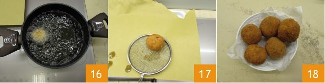 et faites-la frire pendant environ 3 minutes 16, jusqu'à ce qu'elle soit bien dorée. Vous pouvez faire frire quelques pièces à la fois, en surveillant la température de l'huile, qui ne doit pas baisser. Égouttez les boulettes sur un papier absorbant pour friture 17 et servez-les très chaudes 18, accompagnées de la réduction de vinaigre balsamique.