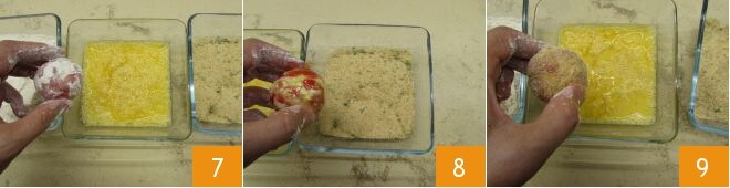 puis dans l'œuf 7, puis dans la chapelure 8, à nouveau dans l'œuf 9