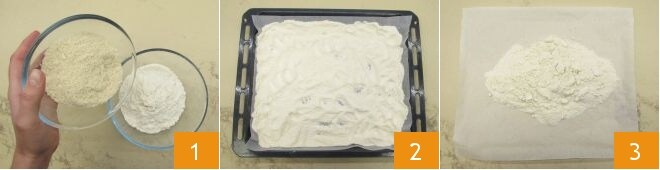 Pour préparer les polvorones, commencez par mélanger la farine 00 et la farine d'amandes dans un bol 1, mélangez bien et répartissez le mélange sur une plaque de cuisson recouverte de papier sulfurisé 2. Torréfiez les farines dans un four à convection préchauffé à 130° pendant environ 20 minutes, puis sortez-les du four et laissez-les refroidir au moins 30 minutes 3. Si le ventilateur de votre four est trop fort, pour éviter qu'elles ne se dispersent, vous pouvez torréfier les farines dans un four statique à la même température.