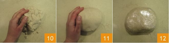 Transférez le mélange obtenu sur le plan de travail et commencez à le travailler avec les mains 10 : étant sans œufs, le mélange sera d'abord difficile à compacter mais vous finirez par obtenir une pâte lisse et uniforme 11. Enveloppez la pâte dans du film alimentaire 12 et laissez-la reposer à température ambiante pendant 20 minutes.