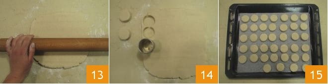 Après le temps de repos, étalez la pâte jusqu'à une épaisseur de 1 cm 13, puis découpez les petits biscuits à l'aide d'un emporte-pièce circulaire de 4 cm de diamètre 14. Disposez délicatement les petits biscuits sur une plaque de cuisson recouverte de papier sulfurisé 15 et faites cuire dans un four statique préchauffé à 160°-170° pendant environ 20 minutes, en plaçant la plaque sur la grille centrale.