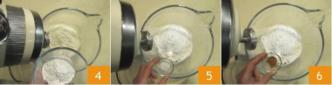 Une fois refroidies, transférez les farines torréfiées dans le bol d'un robot (ou dans un grand bol si vous travaillez à la main), ajoutez ensuite le sucre glace 4, le sel 5 et une pincée de cannelle en poudre 6 ;
