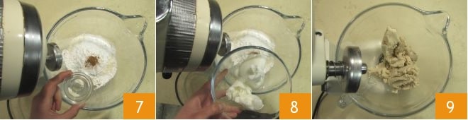 ajoutez également la liqueur d'anis 7 et le saindoux froid (alternativement comme indiqué dans le conseil, vous pouvez utiliser du beurre) 8 et mélangez avec le crochet plat jusqu'à ce que les ingrédients soient amalgamés 9.