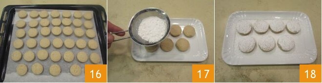 Une fois cuits, les petits biscuits seront encore un peu mous, si vous les touchez du bout des doigts, une partie de la pâte restera collée : ne vous inquiétez pas, ils se solidifieront une fois refroidis 16. Après les avoir laissés refroidir, saupoudrez-les de beaucoup de sucre glace 17 et servez les polvorones à vos invités 18 ou enveloppez-les dans du papier de soie pour les offrir à vos amis !