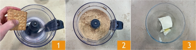 Pour préparer les pommes de pin en chocolat, commencez par mixer les biscuits secs dans un blender 1 jusqu'à les réduire en une poudre fine et uniforme 2, puis transférez-les dans un grand bol. Versez le beurre dans un autre bol 3 et faites-le fondre au micro-ondes.