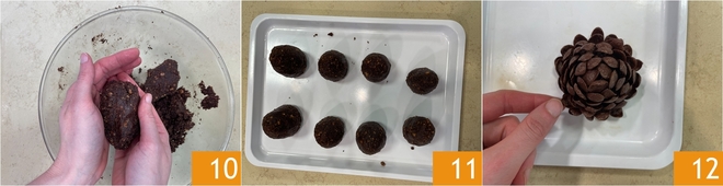 À ce stade, formez les pommes de pin en modelant la pâte en petites pyramides 10; avec ces doses, vous en obtiendrez 8. Disposez-les au fur et à mesure sur un plateau 11 ou une assiette. Maintenant, vous pouvez passer à la partie la plus amusante : décorer les pommes de pin avec les céréales au chocolat. Disposez les céréales une par une, en commençant par la pointe et en vous dirigeant vers la base, créant des cercles concentriques qui donneront la forme caractéristique de "pomme de pin" 12.