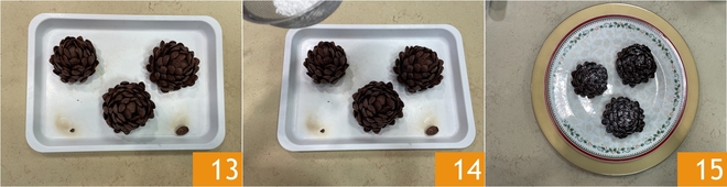 Quand toutes les pommes de pin seront prêtes 13, transférez-les au réfrigérateur et laissez-les raffermir pendant au moins une demi-heure. Décorez les pommes de pin en chocolat avec du sucre glace 14 et servez-les 15 !