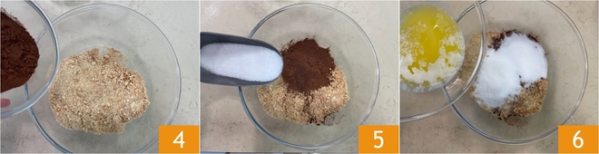 Ensuite, ajoutez dans le bol avec les biscuits le cacao amer 4 et le sucre 5, puis versez le beurre fondu tiède 6.