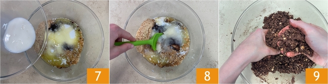 Ajoutez également le lait 7 et mélangez d'abord avec une cuillère 8. Pétrissez ensuite à la main jusqu'à obtenir un mélange homogène 9.