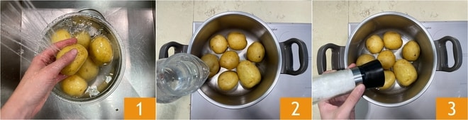 Pour préparer les pommes de terre à la cocotte-minute (avec la peau), commencez par bien les laver 1. Transférez-les ensuite dans la cocotte-minute de 4,5L et ajoutez les 250 g d'eau 2. Ajoutez également une pincée de sel 3. Il est préférable que les pommes de terre ne se chevauchent pas et restent légèrement espacées entre elles.