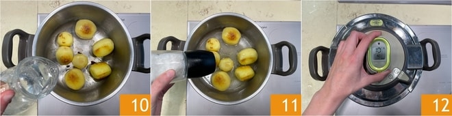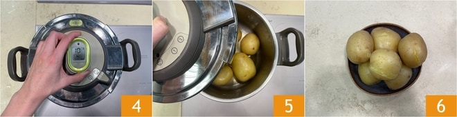 Fermez bien avec le couvercle de la cocotte-minute, fermez la soupape 4 et faites chauffer à feu moyen-élevé. Dès que vous entendez le premier sifflement, signe que la cocotte est sous pression, faites cuire à feu moyen-doux pendant 10 minutes. Éteignez le feu, soulevez la soupape pour libérer la vapeur (faites attention à ne pas vous brûler). Dès que la cocotte n'est plus sous pression et que la soupape de contrôle est abaissée, vous pouvez ouvrir le couvercle 5. Sortez les pommes de terre sans vous brûler 6 et utilisez-les comme vous le souhaitez !