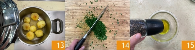 Une fois cuites, éteignez le feu. Soulevez la soupape de manière à évacuer rapidement toute la vapeur contenue dans la cocotte-minute (effectuez cette opération avec précaution pour ne pas vous brûler).  Dès que la cocotte n'est plus sous pression et que la soupape de contrôle est abaissée, vous pouvez ouvrir le couvercle 13 et transférer les pommes de terre dans un récipient. Préparez l'assaisonnement, en commençant par hacher finement le persil 14, puis dans un petit bol, versez l'huile, le sel et le poivre 15.