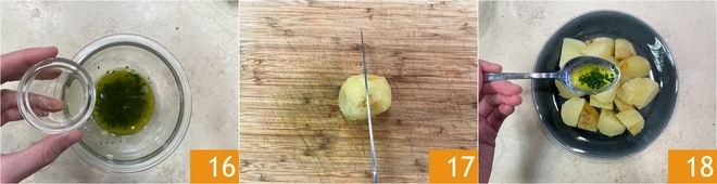 Ajoutez le persil, le vinaigre 16 et mélangez bien. Reprenez maintenant les pommes de terre et coupez-les en 4 17. Transférez-les dans une assiette et assaisonnez-les avec l'émulsion fraîchement préparée. Elles sont excellentes aussi bien tièdes que froides.