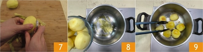 Pour préparer les pommes de terre à la cocotte-minute (sans peau), versez dans la cocotte-minute de 4,5L un filet d'huile généreux et laissez-le chauffer à feu moyen-doux. Épluchez les pommes de terre 7, versez-les dans la cocotte-minute 8 et faites-les bien dorer de tous les côtés 9. Quelques minutes suffiront.