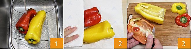 Pour préparer les pommes de terre et poivrons, commencez par laver les poivrons 1, séchez-les avec du papier absorbant 2, puis coupez-les en deux et enlevez leur pédoncule vert extérieur, les filaments blancs 3 et les graines internes.