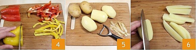 Coupez les poivrons en lanières d'environ 1 cm à 1 cm et ½ 4, et placez-les dans un bol. Épluchez les pommes de terre 5, et coupez-les en quartiers pas trop fins (1 cm) 6.