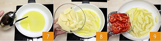 Dans une grande poêle, mettez l'huile d'olive extra vierge et faites-la chauffer 7, puis ajoutez les pommes de terre 8, les poivrons rouges 9