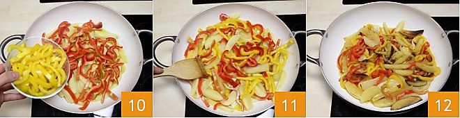 et les poivrons jaunes 10. Faites cuire les légumes et à l'aide d'une spatule, remuez de temps en temps délicatement en faisant attention à ne pas briser les pommes de terre 11, ajustez le sel et poursuivez la cuisson jusqu'à ce que les ingrédients soient bien cuits et présentent une belle dorure croquante 12 (cela prendra environ 20 minutes), retirez du feu et servez les pommes de terre et poivrons bien chauds.